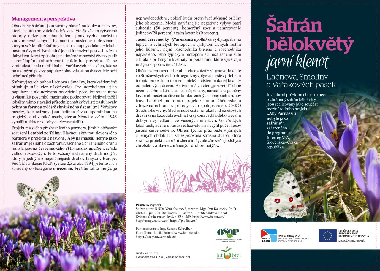 V rámci projektu "Aby parnassiů nebylo jako šafránu" vydalo občanské sdružení ochránců přírody informační leták - skládačku, kterou si můžete prohlédnout nebo stáhnout v této sekci. Skládačka byla vydána v nákladu 30 000 výtisků a distribuována do informačních center v příhraničí ČR-SR. V případě zájmu o originální tištěnou formu je možné si ji objednat na emailové adrese osopvm@centrum.cz.
